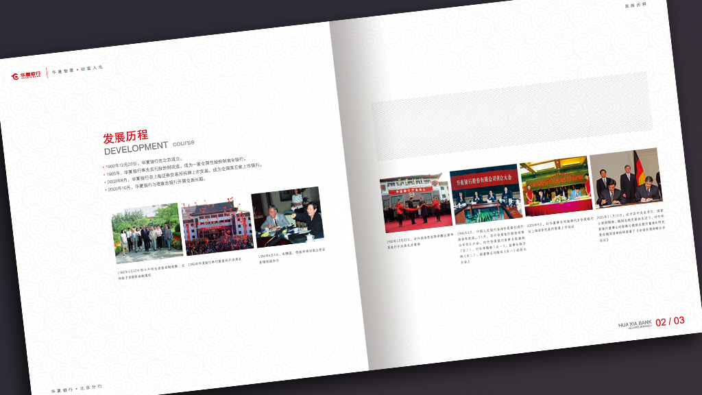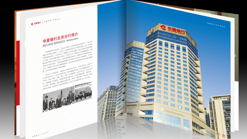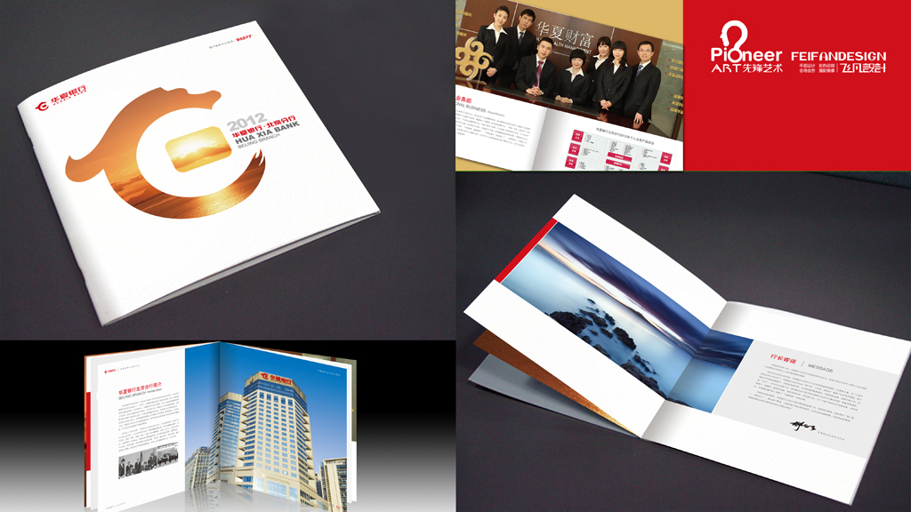在這個案例中,我們先從了解華夏銀行的歷史及發(fā)展開始,多次參觀其北京分行,并組織專業(yè)攝像人員從大樓外體,到營業(yè)廳,到各部門,特別大客戶中心拍攝了大師的圖片素材;再分析目標(biāo)群體的消費及審美需求定位,分析同行業(yè)的其它行的宣傳品的優(yōu)點和缺點,同時與分行領(lǐng)導(dǎo)溝通,以明確設(shè)計方向。