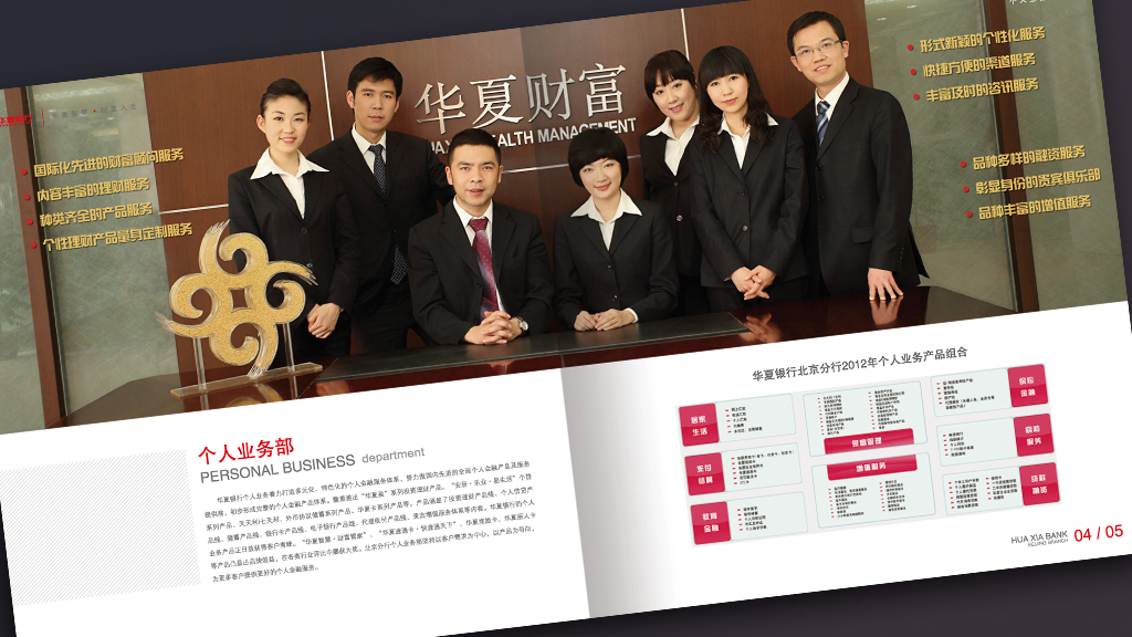1、目的:這是華夏銀行北京分行,設(shè)置了大客戶服務(wù)中心并裝修完成后,需要面向客戶和潛在客戶建立形象,通過宣傳冊的設(shè)計印刷,舉辦推介會及活動等進行傳播和發(fā)放,提升北京分行整體的形象和服務(wù)水平。