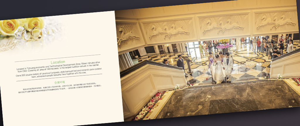 作為一個(gè)定位高端的婚慶軟硬服務(wù)商,我們首先定調(diào)了該宣傳品設(shè)計(jì)檔次定位,要的就是高大上形象氣質(zhì),同時(shí)核心受眾定位群為高知女性,所以,也要親和感性。視覺(jué)和設(shè)計(jì)上,以攝影角度專業(yè)、優(yōu)美的大圖為核心,結(jié)合一段優(yōu)美的形容婚姻美好散文簡(jiǎn)句,將視覺(jué)與浪漫氣息以畫面呈現(xiàn);再以講故事的方式,表現(xiàn)完美婚禮的全過(guò)程;最后各種現(xiàn)場(chǎng)案例圖片,讓閱者有身臨其境的感受。